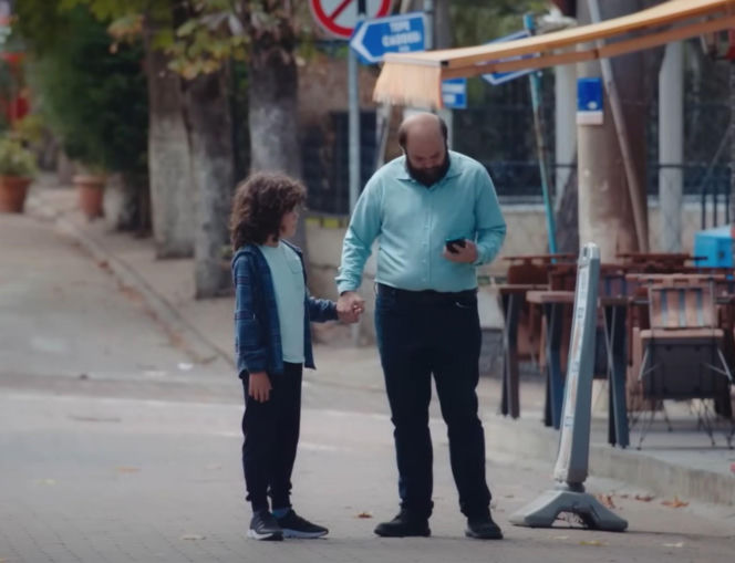 Sahin, mężczyzna z brodą i łysiejącą głową, w błękitnej koszuli w kropki, patrzy w dół z zaniepokojeniem. Kadr przedstawia aktora z serialu „Dziedzictwo”, który stoi przed trudną decyzją dotyczącą małego Yusufa, o czym można przeczytać na Super Seriale.