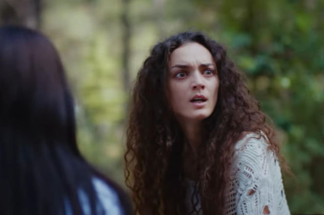Kobieta o długich, kręconych włosach, z szeroko otwartymi, wystraszonymi oczami i ustami w szoku. Ma na sobie biały, ażurowy sweter. W tle rozmazany zielony las. Z prawej strony widać fragment postaci innej osoby z ciemnymi włosami. Scena z serialu „Dziedzictwo”, więcej o tych i innych Super Seriale znajdziesz u nas.