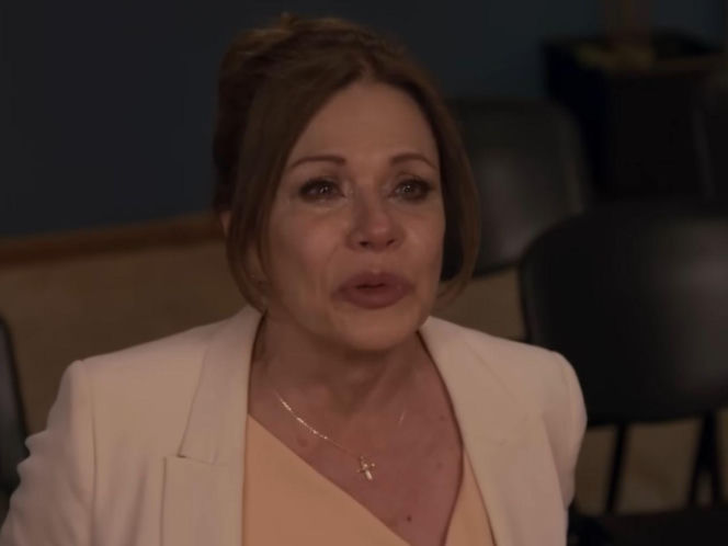 Kobieta o jasnych włosach, ubrana w beżową marynarkę i naszyjnik z krzyżykiem, ze łzami w oczach i otwartymi ustami, wyraża smutek lub wzruszenie. Twarz ma pomarszczoną, a spojrzenie skierowane lekko w górę. Tło jest ciemne, niewyraźne, z zarysem krzeseł. Więcej o losach bohaterki "Pani García i jej córki" na Super Seriale.