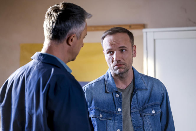 Dwóch mężczyzn, Łukasz Płoszajski jako Artur i Maciej Mikołajczyk jako Janek z serialu "Pierwsza miłość", stoi w pomieszczeniu. Janek, ubrany w jeansową kurtkę, patrzy z zamyśloną miną. Artur stoi tyłem, ubrany w niebieską koszulę. Więcej o ich losach w "Super Seriale".