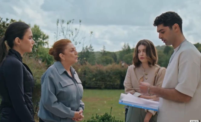 Grupa czterech osób, w tym Seyran Şanlı, Ferit Korhan, oraz kobieta w średnim wieku z rudymi włosami i młoda kobieta z jasnymi włosami, prowadzi rozmowę na świeżym powietrzu, prawdopodobnie z tureckiego serialu "Złoty chłopak", o którym można przeczytać na Super Seriale.