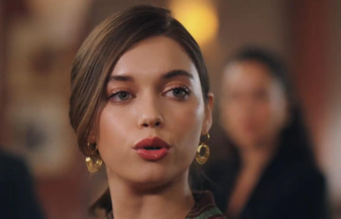 Zbliżenie na twarz Seyran Şanlı, którą gra Afra Saraçoğlu z serialu "Złoty chłopak", z otwartymi ustami i złotymi kolczykami. W tle widać niewyraźną postać. Dowiedz się więcej o jej sprytnym planie i odcinku 274 na Super Seriale.