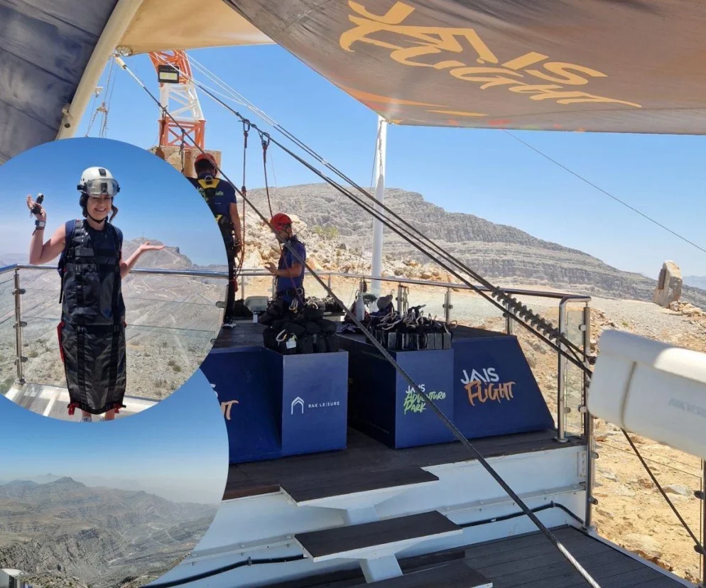 Jais Flight liczy imponujące 2,83 kilometra długości, a podczas zjazdu osiąga się prędkość nawet 150–160 km/h. Lot trwa niespełna trzy minuty, ale intensywność doznań sprawia, że czas zupełnie traci znaczenie. Lecisz głową w dół, w pozycji przypominającej lot superbohatera, nad głębokimi wąwozami i poszarpanymi szczytami gór Hajar, na wysokości 1680 metrów nad poziomem morza. Po pierwszym, dłuższym odcinku lądujesz na platformie zawieszonej około 80 metrów nad ziemią, ze szklanym dnem, skąd ruszasz w dalszą, już krótszą, ale równie emocjonującą część trasy.