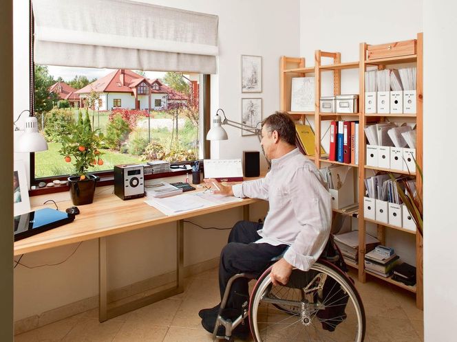 Mężczyzna na wózku inwalidzkim pracuje przy biurku obok okna z widokiem na domy. Pokój urządzony jest w jasnych barwach z drewnianymi regałami, pełnymi dokumentów. Na biurku widać kalendarz, lampę i doniczkową roślinę. Artykuł o pracy rencistów na Super Biznes.