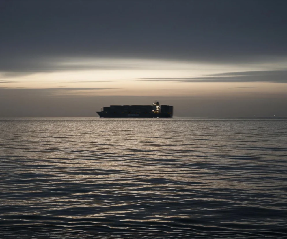 Autor: Redakcja Informacyjna AI/ Wygenerowane przez AI W centrum obrazu znajduje się duży statek towarowy o ciemnej sylwetce, płynący po spokojnym morzu. Na statku widoczne są liczne podświetlone okna i elementy, tworzące poziome pasy jasnego światła. Horyzont przebiega przez środek kadru, dzieląc go na ciemniejsze niebo i pofalowaną, ciemną wodę. Górna część nieba jest w kolorze ciemnoszarym, przechodzącym niżej w jaśniejszy, mleczny odcień, a następnie w ciemniejszy, szarobrązowy pas nad horyzontem.
