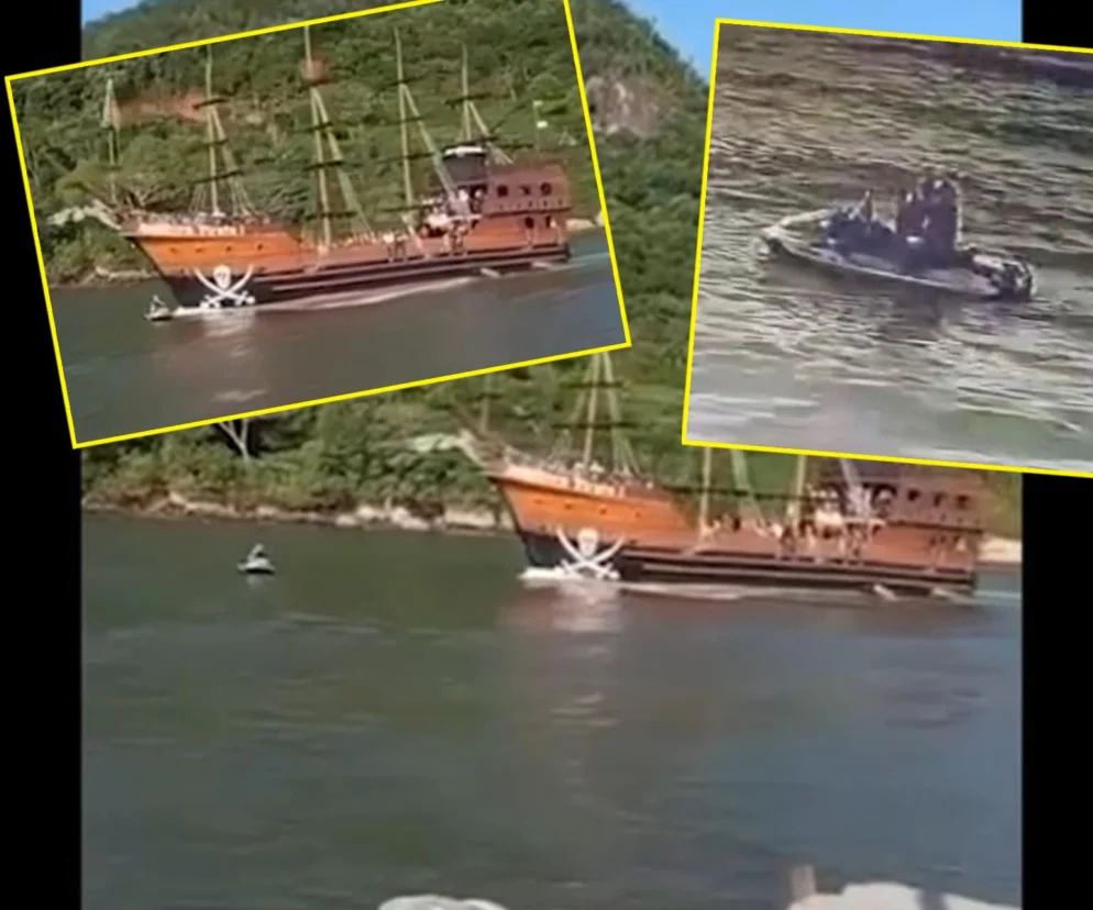 W spokojnym dotąd brazylijskim kurorcie Balneario Camboriu doszło do pirackiej katastrofy! To popularne miejsce wypoczynku nad oceanem, często nazywane „Dubajem Brazylii”. Tym razem zamiast sielanki były chwile grozy. W niedzielę po południu doszło w "Dubaju" do zderzenia dużego statku turystycznego ze skuterem wodnym. Na skuterze w chwili zderzenia akurat całowała się namiętnie para zakochanych, co dobrze widać an nagraniu z monitoringu, które trafiło do mediów społecznościowych. Z nagrania wynika, że oboje byli zajęci sobą i nie zwracali uwagi na to, co dzieje się wokół. A tymczasem właśnie w tym czasie w ich stronę płynął duży statek wystylizowany na piracką łajbę! Operator statku niestety najprawdopodobniej nie zauważył skutera.