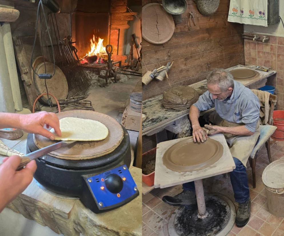 Wracając do Roselli i Maurizia, to właśnie oni z największą starannością i pasją kontynuują rękodzielniczą tradycję regionu Emilia-Romania. Od lat 90. prowadzą pracownię tradycyjnych glinianych talerzy, na których wypieka się słynną piadinę. Ich warsztat jest otwarty dla turystów, szkolnych wycieczek oraz każdego, kto chce zobaczyć proces powstawania talerzy z Montetiffi lub zaopatrzyć się w takie naczynie. Wraz z innymi uczestniczkami podróży miałyśmy okazję obserwować cały proces wyrabiania talerzy. Maurizio zaprezentował nam wszystkie etapy produkcji, co było niezwykle cennym doświadczeniem, zwłaszcza że oni jako jedyni wciąż kultywują tę unikatową tradycję. Ale od początku…