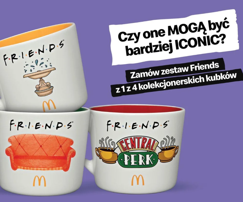 Właśnie nadszedł długo wyczekiwany przez wielu moment. Od 4 marca w Zestawie FRIENDS pojawi się kolekcjonerski kubek z jednym z czterech motywów do wyboru: z kultową kanapą, fontanną znaną z czołówki serialu, ulubioną kawiarnią bohaterów czy charakterystycznymi fioletowymi drzwiami z ozdobionym żółtą ramką wizjerem. Mmm… kawa w takim kubku brzmi jak podróż do świata FRIENDS. Baza zestawu pozostaje taka sama jak w zestawie z figurkami, czyli średnie frytki, średni napój, sos Monica’s Marinara oraz jeden z kultowych produktów – Big Mac, McChicken, McRoyal lub 9 szt. McNuggets. Ale to nie wszystko! Friends pojawią się także w ofercie śniadaniowej. Kubki będą dostępne w McZestawie Śniadaniowym z wybranym McWrapem lub z Kajzerką. Wpadaj do McDonald’s i wybierz kubek z ulubionym motywem!