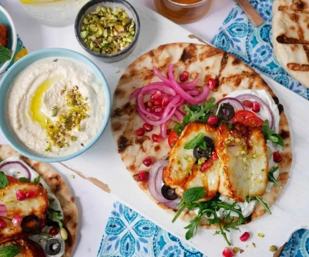 Osusz halloumi ręcznikiem papierowym i pokrój na cieńsze plastry. Pokrojoną cebulę zalej octem i odstaw na kilka minut do szybkiego zamarynowania. Posmaruj ser oliwą, ułóż w koszyku air fryera i piecz w temperaturze 200°C przez 8-10 minut, obracając w połowie czasu. W piekarniku przygotuj go w 220°C przez około 12-15 minut, również przewracając w trakcie pieczenia, a na patelni smaż na suchej, dobrze rozgrzanej powierzchni przez 2-3 minuty z każdej strony. Po przygotowaniu owiń halloumi folią, aby pozostało ciepłe. Placki skrop delikatnie wodą i podgrzej w urządzeniu przez około 5 minut w 200°C lub przez chwilę w piekarniku. Na ciepłych plackach rozsmaruj hummus i tzatziki, ułóż halloumi, a następnie dodaj marynowaną cebulę, oliwki, granat, pomidorki oraz wybraną sałatę. Całość polej odrobiną miodu i posyp pistacjami.